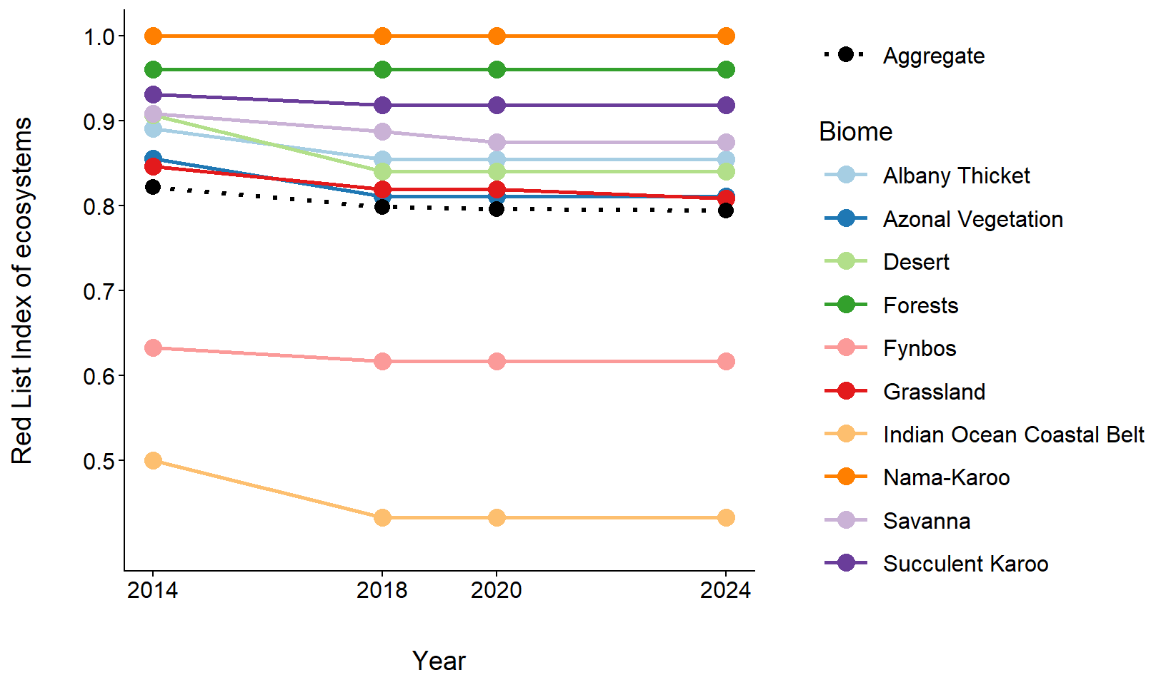 The Indian Ocean Coastal Belt has experienced the steepest decline and has the lowest overall RLIe, falling from 0.50 in 2014 to 0.43 in 2024. All ecosystem types in this biome are threatened and over time they are moving into higher risk categories. This steep downward trend reflects growing pressures from land-use conversion, including the expansion of croplands, urban development, and plantations. The Fynbos Biome, renowned for its exceptional biodiversity, faced substantial historical pressures resulting in low RLIe scores (0.62) but these are reasonably stable since 2018 suggesting that the main drivers of change, particularly agricultural pressure in lowland areas, have been entrenched for many years. In the Desert, Albany Thicket and Grassland biomes there are fewer threatened ecosystems and hence slightly higher RLIe (~0.8) but these scores have dropped substantially since 2014, suggesting accelerating pressures.